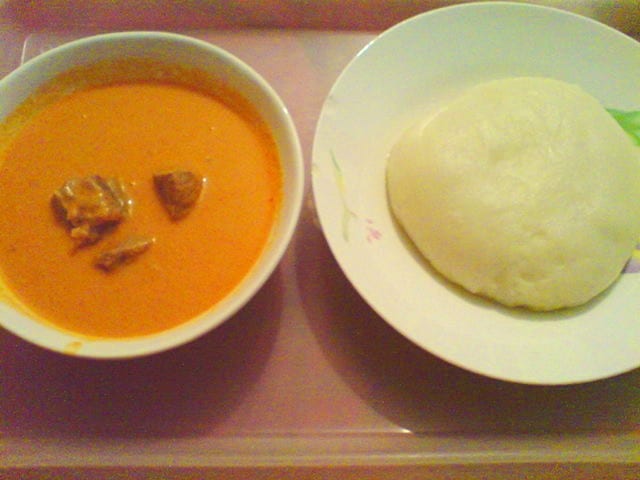 Made with cassava, plantain or yam (not the USA sweet potato – white similar to potato) Fufu is not chewed by swallowed and usually served with soup or stew